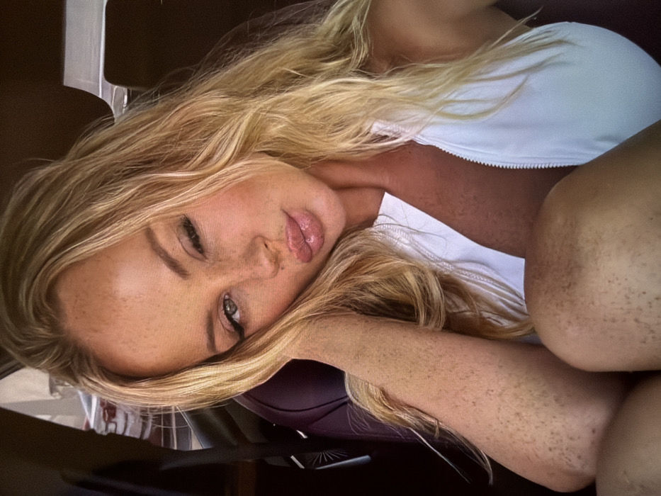 n adult female subject seated inside what appears to be a vehicle. She has long, wavy blonde hair and a light complexion with prominent freckles on her face, arms, and upper chest. Her right eye is open, while her left eye is closed in a wink, and her lips are puckered. Dark eyeliner is visible. She wears a white garment, possibly a halter top or swimwear, featuring a vertical zipper down the front. Her right arm is bent with her hand supporting her head. The interior of the vehicle includes dark reddish-brown upholstery visible behind her. The background, seen through a window, is blurred and indistinct, showing faint shapes of what might be an outdoor environment and a light-colored vehicle. The specific location within Blankenfelde, Germany, cannot be determined from the visual evidence.