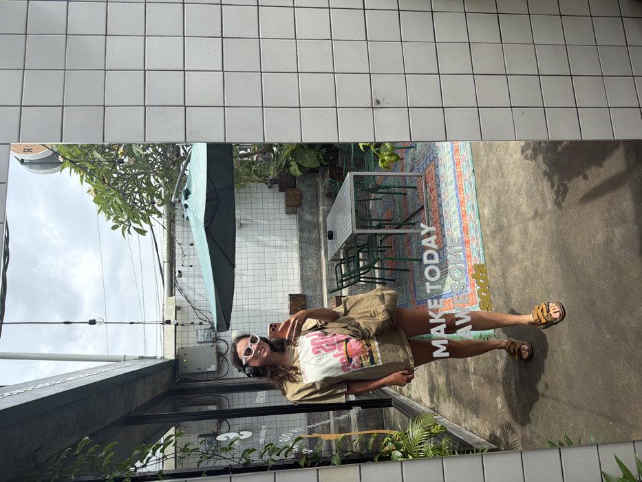 A reflection in a rectangular mirror shows a woman standing outdoors in a cafe setting. She is wearing a t-shirt, shorts, sandals, headphones, and sunglasses, and holding a phone, seemingly taking a picture of herself. The reflection includes a glimpse of a patio area with a table, chairs, an umbrella, a patterned rug, and various plants. The upper portion of the image is a tiled wall, acting as a contrasting background to the mirrored scene.