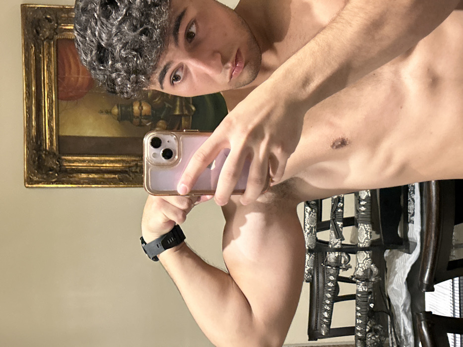 The image captures a shirtless young adult male taking a mirror selfie indoors in the city of Sarouja Municipality, Syria
