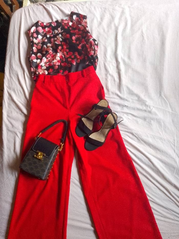 A floral print sleeveless top sits above bright red, wide-leg trousers. A black patterned purse with gold hardware is placed on the left side of the trousers. A pair of black high-heeled sandals are nestled on the right side of the trousers. The items are arranged on a rumpled white sheet.