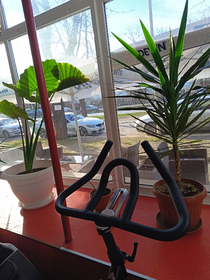 The scene depicts an interior view looking outwards through a large window in Cherven Bryag, Bulgaria. In the immediate foreground, the black handlebars and silver central shaft of an exercise spin bike are visible, positioned on a red, textured floor. To the left, a large-leafed potted plant in a white pot and saucer stands on the red surface. A red vertical structural pole extends from the lower left towards the top center, partially obscuring the view through the window. To the right of the spin bike, a Yucca plant in a brown terracotta-style pot and saucer also rests on the red surface. Through the window, a bright, sunlit outdoor area is visible. A light-colored (likely silver or white) BMW coupe with multi-spoke dark wheels is parked on a grassy area to the left. Behind the BMW, a white outdoor umbrella with a central pole is open. To the right, outdoor patio furniture, including wicker-style chairs and tables, is visible. Bare tree branches and trunks are present in the mid-ground and background, suggesting a non-foliage season. Distant vehicles are partially visible further down a street or parking area. A sign with white text, partially decipherable as "EDEN," is visible through the window above the Yucca plant. No individuals are present in the visible area.