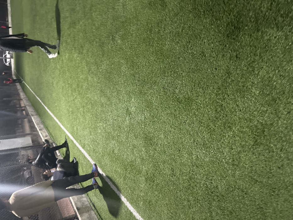 An artificial turf soccer field is depicted with a white sideline marker. Several people stand along the sideline next to a chain-link fence. The field itself is a vibrant green and appears well-maintained. Some of the people are wearing athletic shoes, suggesting they may be involved in playing or training on the field. The lighting suggests it is either dusk or an artificially lit field.