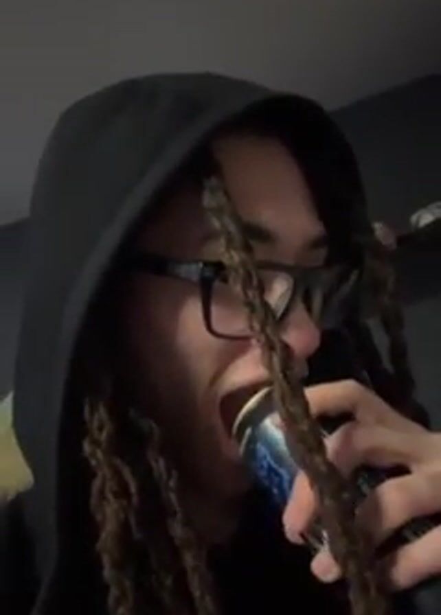 person with dreadlocks and glasses wearing a black hooded sweatshirt drinking from a dark-colored can. They are holding the can with both hands and bringing it to their mouth to drink. The background is a light-colored wall with a shelf visible in the upper right corner.