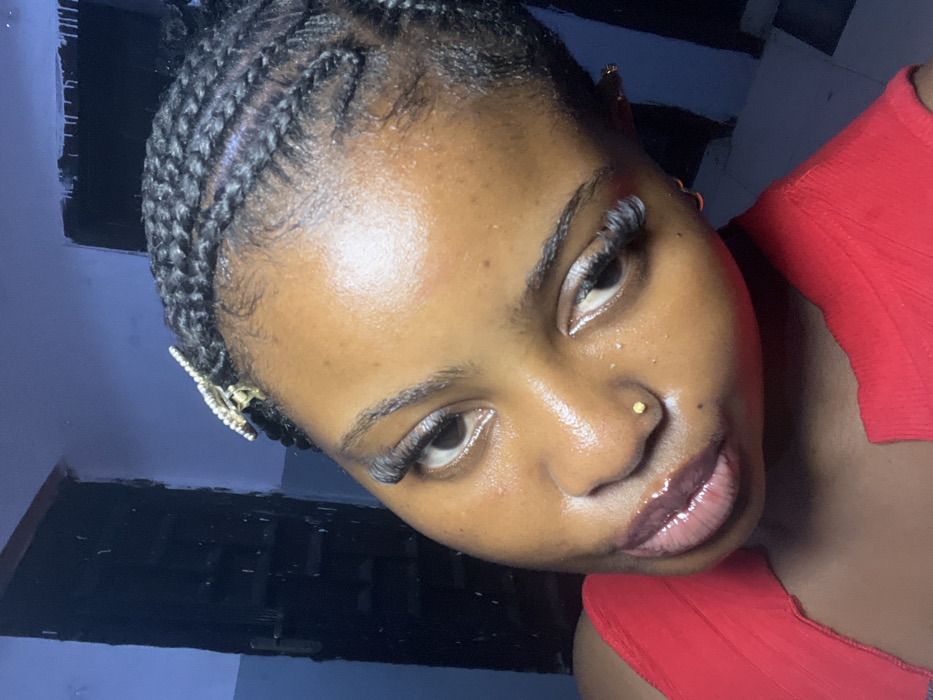 A female individual with dark skin is depicted in a close-up portrait, slightly angled upwards and to the right. Her hair is styled in black cornrows, secured with a small, light-colored decorative hair clip featuring visible elements, positioned on the upper left side of her head. She has dark eyes, prominent eyelashes, groomed eyebrows, and full lips with a glossy finish. A small, gold-colored stud is present on her left nostril. She is wearing a red garment with a discernible ribbed texture. The background consists of a dimly lit dark blue wall. To the left, a dark, vertical rectangular object, possibly a closed door, is visible, featuring a metallic door handle. Irregular white markings or paint drips are present on the upper right portion of the background wall. The scene is located in Ipetumodu, Nigeria.