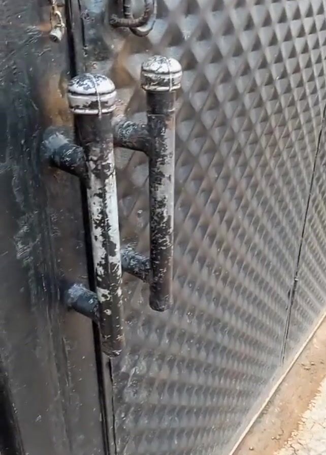 A person opens a black metal gate. The gate has a textured pattern of raised diamonds. The handle is made of two parallel bars, each with a round cap. As the gate is opened, a medium-sized brown and black brindle dog runs through the opening. The ground is concrete. There is a metal grate visible.