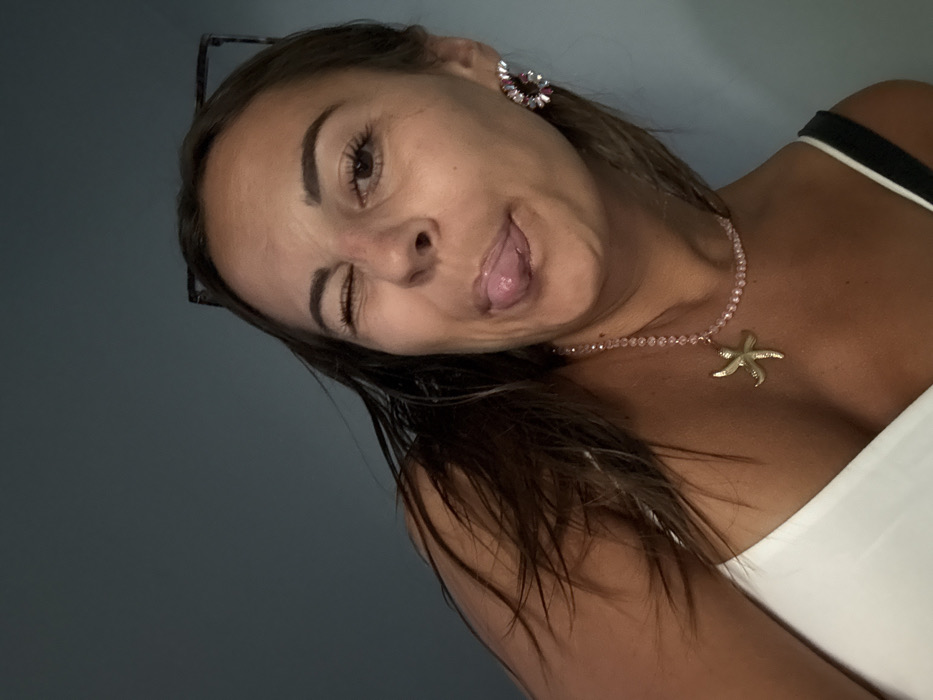 A female individual is depicted in a close-up, selfie-style photograph taken indoors in Goviyapana, Sri Lanka. She is facing the camera directly, winking with her left eye closed and her right eye open, while extending her tongue outwards from her mouth. Her head is tilted slightly to her left. She has medium-brown hair and is wearing a white top, possibly strapless. A black strap is visible on her right shoulder. Around her neck, she wears a light pink beaded necklace with a golden starfish pendant. A multi-stone earring, featuring white and pink/red elements, is visible on her right ear. The background consists of a plain, dark greyish-blue wall. A dark, rectangular object, possibly eyeglasses, is partially visible above her head on the upper right side of the frame.