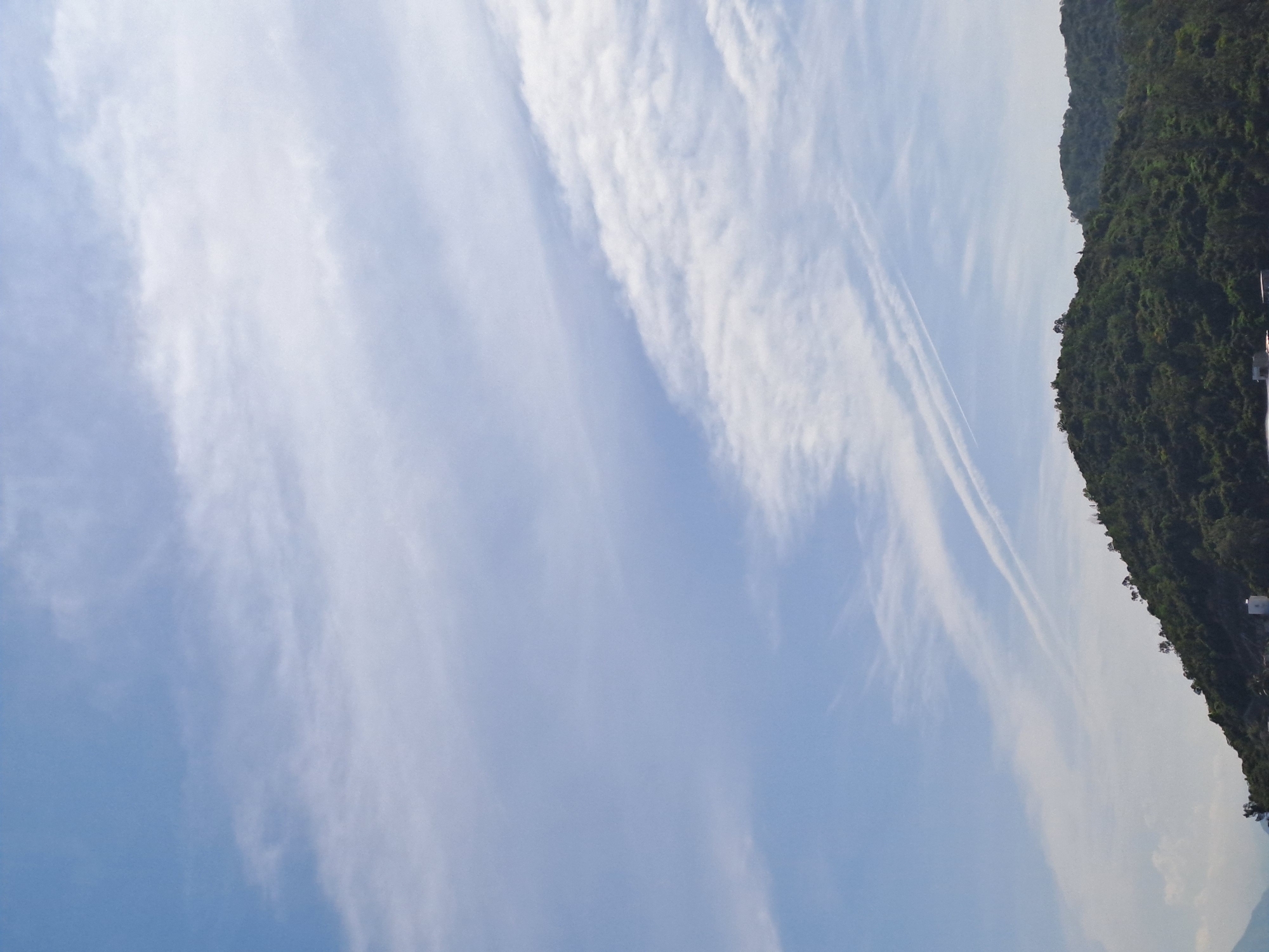 view of the sky over Nha Trang, Vietnam. Wispy, white clouds are scattered across a light blue sky. Jet contrails are visible. On the right side of the frame, a mountainside covered in lush, green vegetation is seen.