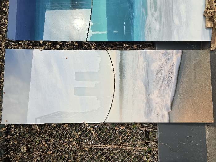 The image displays two tall, rectangular, reflective panels positioned outdoors, leaning against a dark lattice fence overgrown with dry, brown deciduous vines. The foreground consists of a dark grey, cracked concrete or paved surface. The leftmost panel, vertically oriented, reflects a pale blue sky with faint cloud cover in its upper section. Below this, a clear reflection of two distinct, tall rectangular skyscrapers, characteristic of modern Tel-Aviv architecture such as the Azrieli Sarona Towers, is visible against the sky. The lower half of this panel depicts a serene sandy beach scene with white foam from gentle waves receding towards the shore, and a calm sea extending to a horizon. A single thin, dark horizontal wire or cord is present across the mid-section of the reflected sea. The rightmost panel, also vertically oriented and slightly offset, features a more vibrant blue and cyan color palette. Its upper portion reflects a bright sun glare against a blue sky, with reflections of urban high-rise buildings and a distant sea line. The lower part of this panel shows a white foamy wave on water, possibly a continuation or variation of the beach theme. This panel is supported at its base by a rough wooden pallet and some light-colored debris. The environment is an urban outdoor setting, consistent with a public walkway or street adjacent to a boundary wall or fence. The reflections of prominent city skyscrapers and the beach imagery place the scene likely near the coastal area of Tel-Aviv, Israel. No individuals are visible in the image.