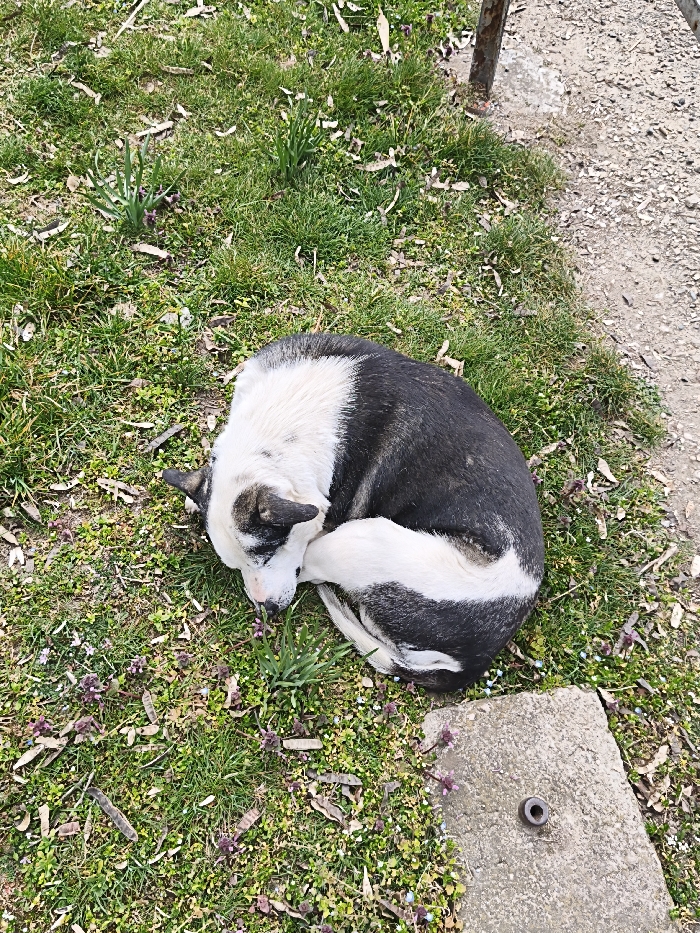 - "An overhead view in Osetenovo, Bulgaria, depicts a black and white dog curled tightly on a patch of green grass, appearing to be asleep or resting" by FM-q92mr1, licensed under CC BY 4.0