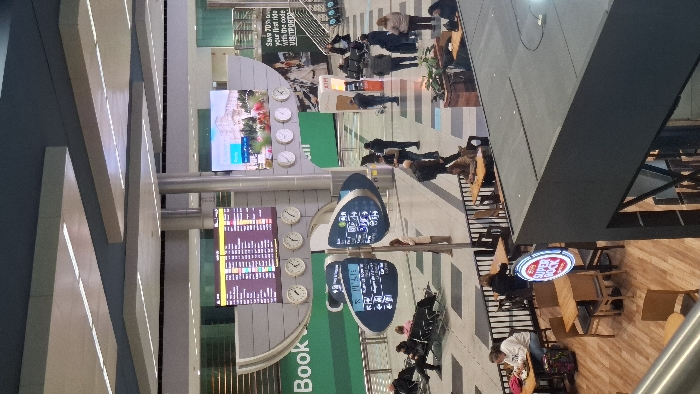 An airport scene is depicted with a flight information board on the left, surrounded by various clocks. People are milling about, some sitting, others walking with luggage. A restaurant area features tables and chairs, and a sign with red and white lettering is visible. There is a large directory sign with international symbols. The overall scene conveys a busy and modern airport terminal.