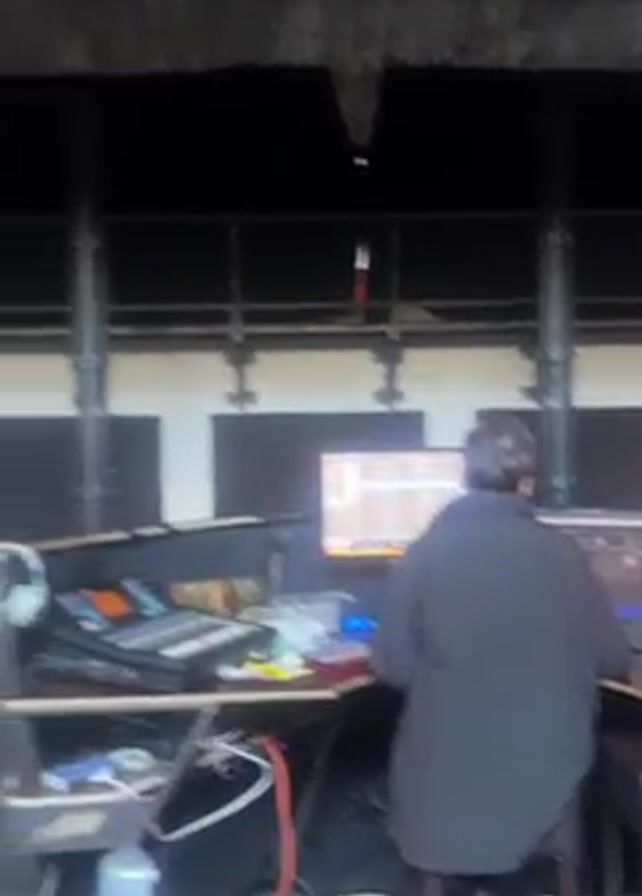 inside of a studio. A man wearing a black coat sits at a desk in front of a computer. There is recording equipment around the desk. The studio is decorated with several black, square soundproofing panels on the walls, and two tall, gray cylinder-shaped heaters stand on either side of the desk. Sunlight streams through a window near the ceiling. The camera pans upward to show the arrangement of the soundproofing panels.