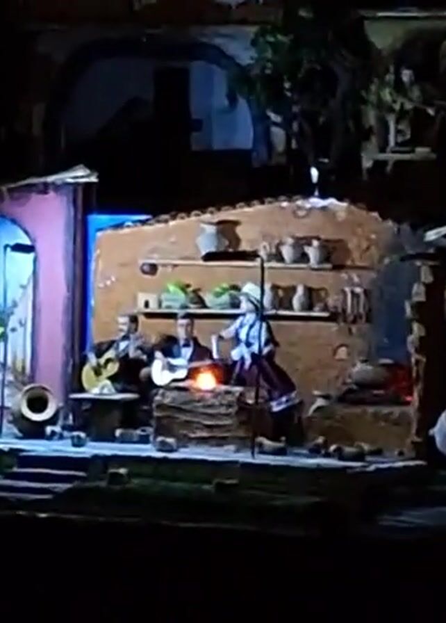 The video depicts a miniature, illuminated scene featuring three figures in a small courtyard setting. Two men sit and play guitars, while a woman in traditional dress stands beside what appears to be a miniature fireplace or burning brazier. The courtyard is flanked by structures resembling houses or buildings, with windows and doorways. Shelves in the background display miniature pottery. The lighting is dim, creating a dramatic effect that highlights the central figures and the glow of the fire. The scene has the air of a traditional diorama or Christmas nativity display, possibly depicting an idealized Spanish or Mexican folk setting.