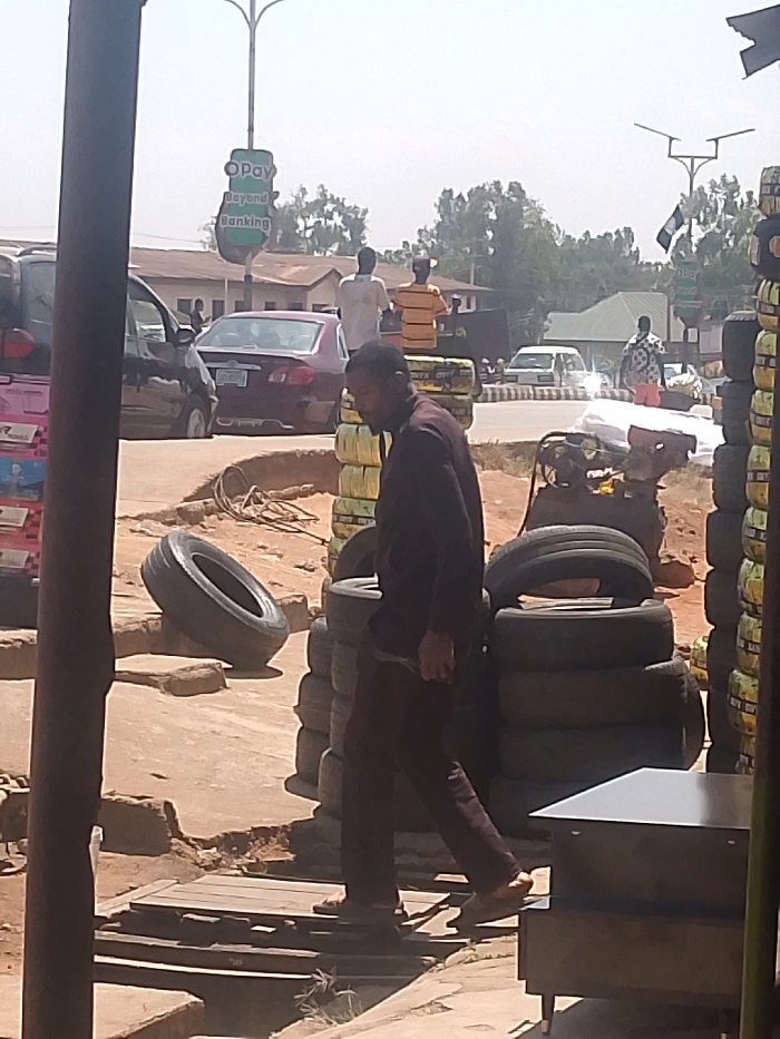 The image portrays an outdoor scene within a commercial area, likely a tire repair shop or market, in Jos, Nigeria, under bright, hazy daylight. In the foreground, a dark-clothed male is depicted walking from right to left, stepping onto a wooden plank bridge that spans a narrow, concrete-lined drain. He holds an unidentified tool in his right hand. To his immediate right, multiple stacks of black vehicle tires, some with yellow and green branding, are prominently displayed, extending towards the right edge of the frame. Behind these stacks, an air compressor or similar machinery is visible on a raised platform. A single black tire rests on its side on the ground to the left of the walking man. The ground surface is a mix of worn concrete and bare earth, exhibiting cracks and an uneven texture. A dark vertical post partially obscures the view on the far left, next to stacked items, some in pink packaging. In the mid-ground, a dark-colored car is partially visible on the far left. A maroon sedan is positioned on a paved road to the left of a prominent lamppost that displays an "OPay Beyond Banking" sign. Ahead of the sedan, two males stand facing away from the camera; one wears a light shirt, the other a striped yellow and brown shirt. Further along the road, a white vehicle is visible approaching an intersection or roundabout, and an individual in a patterned shirt walks on the far right. Another lamppost with a green and white flag, consistent with the Nigerian national flag, is visible further right. The background features low-rise buildings with brown roofs interspersed among numerous green trees under a pale sky.