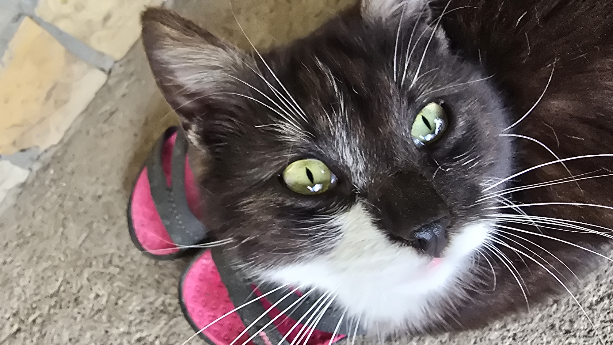 A close-up, high-angle shot depicts a black and white cat lying on a concrete surface. The cat has bright green eyes and long white whiskers. The cat is next to a pair of pink and gray sandals. The location is Samovodene, Bulgaria.