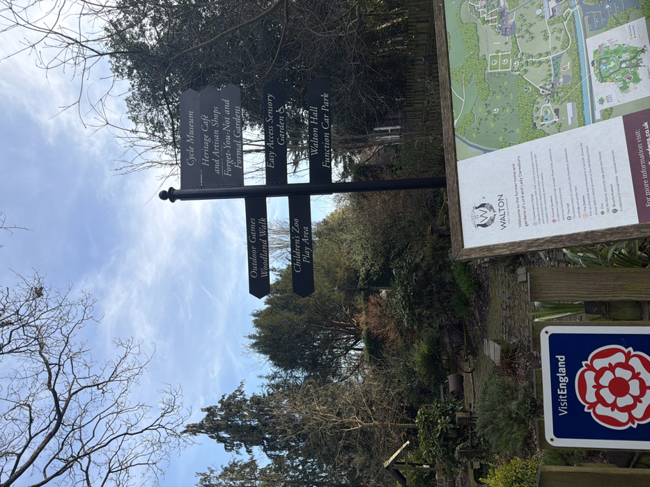 The image displays an outdoor scene at Walton Hall and Gardens in Warrington, United Kingdom, under a clear blue sky with sparse, wispy clouds. A prominent black multi-directional signpost stands centrally, indicating various locations. Its top right arrow points to "Cycle Museum Heritage Café and Artisan Shops Forget-You-Not and Formal Gardens." The top left arrow indicates "Outdoor Games Woodland Walk." The middle right arrow directs towards "Easy Access Sensory Garden &." The bottom left arrow points to "Children's Zoo Play Area," and the bottom right arrow indicates "Walton Hall Function Car Park." In the lower right foreground, a large, wooden-framed information board is angled towards the viewer, displaying the "WALTON HALL AND GARDENS" logo, explanatory text about the estate, and a detailed map of the grounds. To the lower left, a blue "VisitEngland" sign with a red and white Tudor Rose emblem is affixed to a wooden post. Behind these signs, a cobbled path ascends a vegetated slope. The ground is covered with diverse plant life, including bare-branched deciduous trees and dark-foliaged evergreens. Observable objects on the slope include an old metal wheelbarrow, a small wooden structure, and a discarded barrel. The midground and background feature dense tree cover, predominantly comprising mixed deciduous and evergreen species, forming a wooded landscape. A wooden fence is partially visible in the far right background. No individuals are present within the scene.