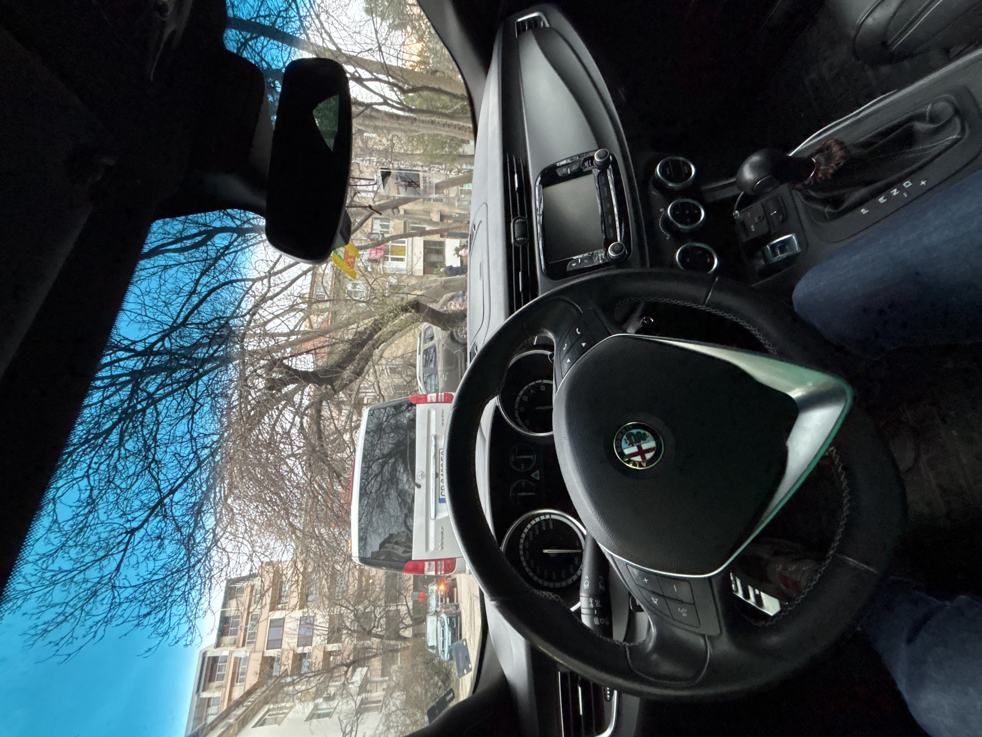 The scene is depicted from the interior perspective of an Alfa Romeo vehicle, looking forward through its windshield onto a residential street in Sofia, Bulgaria. The black leather-wrapped steering wheel, featuring the Alfa Romeo emblem, occupies the lower-left to mid-section of the foreground, with the driver's legs clad in blue jeans visible below it. To the right of the steering wheel, an automatic gear shifter is visible, set in the "P" (Park) position, with a small brown, beaded ornament hanging from its base. The dashboard displays an infotainment screen and three circular climate control dials. A rearview mirror is mounted on the windshield, from which a yellow charm and a rectangular "DRIVE SAFE" air freshener are suspended. Beyond the windshield, a silver Mercedes-Benz Viano 4Matic van is directly in front, facing away from the viewer. Its rear license plate, partially obscured, prominently displays "CB," indicating registration in Sofia, Bulgaria. Behind the van, a dark-colored SUV, possibly a BMW, is visible with its right turn signal flashing. Several other vehicles are present on the street or parked. The street is bordered by multi-story residential buildings, some with balconies, typical of urban European architecture. Numerous bare deciduous trees, indicative of a colder season, line the street. The sky above is clear and bright blue. Indistinct figures of a few pedestrians are visible on the distant sidewalk.