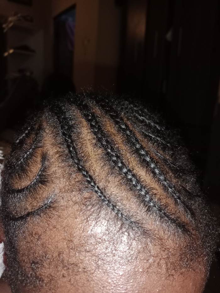 The scene is located in Rafin Par, Nigeria, as specified. The image displays a close-up, overhead view of a human scalp featuring dark, braided hair. Multiple cornrow braids are present, running generally anterior to posterior, with distinct curved patterns observed along the frontal hairline on the left. The scalp exhibits brown pigmentation, with areas of unbraided, shorter hair growth and some reddish-brown tones interspersed within the hair and scalp. The background is dark and out of focus, indicating an indoor setting with subdued lighting; indistinct forms, possibly furnishings, are faintly visible in the upper background.