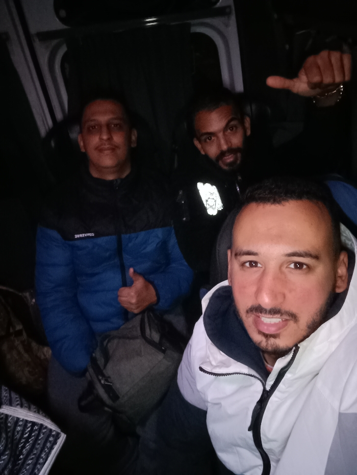 Three men are inside a vehicle. The man in the front wears a white jacket, the one in the middle is wearing a blue jacket and holding a gray bag. The third man in the back wears a black jacket with a white owl image and is giving a thumbs up. The picture is taken in low light conditions.
