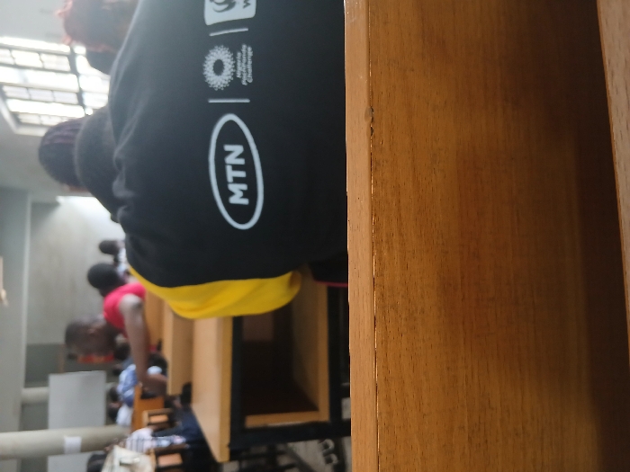 The image depicts an indoor scene, likely a classroom or lecture hall, located in Unknown, Unknown. The perspective is from behind a seated individual, looking forward into a room containing multiple people and rows of wooden desks. In the immediate foreground, a light-brown wooden surface, likely the back of a chair or desk, occupies the lower third of the frame. Directly beyond this, a person is seated with their back to the viewer, wearing a black long-sleeved shirt with yellow upper arm panels. Prominently displayed in white on the back of the shirt are the "MTN" logo, followed by a circular graphic and the text "Nigeria Pitchandala Challenge," and a partially visible "WWF" logo. This individual has dark hair, possibly styled in braids or dreadlocks. Further into the background, several other blurred individuals are visible, seated at similar wooden desks with dark metal frames and open shelves underneath. One person in a red shirt is seen facing towards the right. The room features light-colored walls and large windows on the far right, admitting natural light. A white board or screen is partially visible on the far left wall. Overhead ceiling fixtures are also discernible in the blurred background. The overall scene indicates an organized gathering in a functional space.