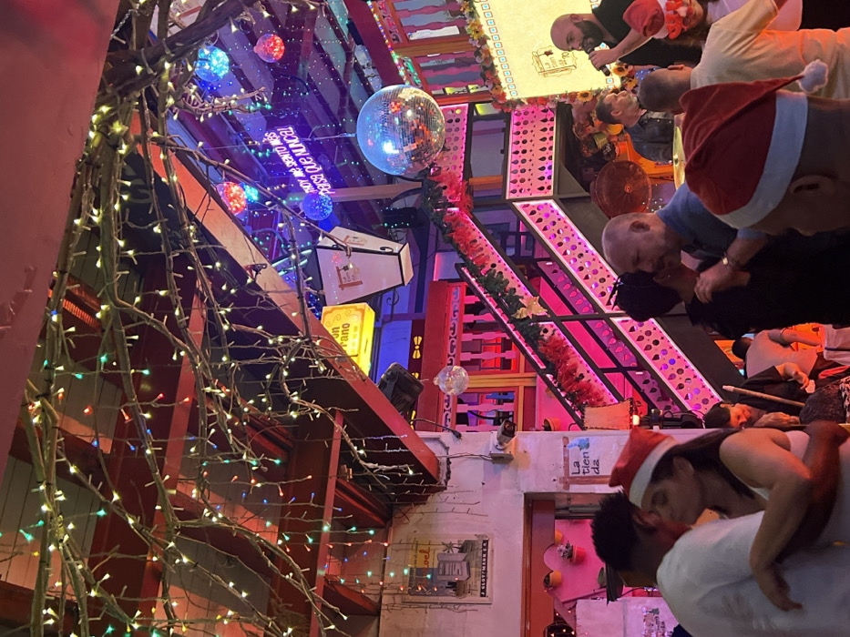 A vibrant, festive scene captures people enjoying a celebration. A mirrored disco ball hangs amidst a colorful, decorated space with string lights, neon signs, and geometric patterns. Multiple couples are kissing, some wearing Santa hats, suggesting a holiday gathering. The atmosphere is lively and celebratory, with a mix of decorative elements contributing to a cheerful ambiance.
