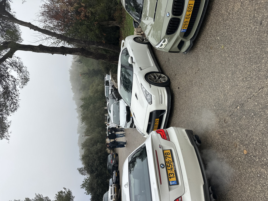 This forensic description details a daytime scene in an asphalt parking area within the Mate Yehuda Regional Council, Israel, characterized by heavy fog and damp ground. In the immediate foreground, the rear of a white BMW 1-series coupe, bearing Israeli license plate `IL 13-456-78`, is visible on the left. White exhaust fumes are actively emitting from its quad tailpipes. To its right, centrally positioned, is a white Nissan GT-R (R35) coupe, displaying Israeli license plate `IL 31-111-79`. On the far right foreground, the front-right quarter of an olive-green BMW M2 (G87) coupe, with Israeli license plate `IL 299-04-601`, is present. In the mid-ground, a cluster of approximately six to eight adult males, dressed in casual attire including hoodies and jackets, are standing and interacting near a white Skoda SUV and other parked vehicles. The background reveals additional vehicles, including a white Land Rover Defender 110, multiple sedans, and SUVs, all bearing Israeli license plates. The distant terrain consists of densely forested hills covered in green and some reddish-brown foliage, significantly obscured by thick fog or mist. A large, prominent multi-trunked tree with sparse branches occupies the right side of the frame, with smaller trees and shrubs defining the perimeter of the parking area. The scene depicts a gathering of people and performance vehicles in a misty, elevated outdoor environment.