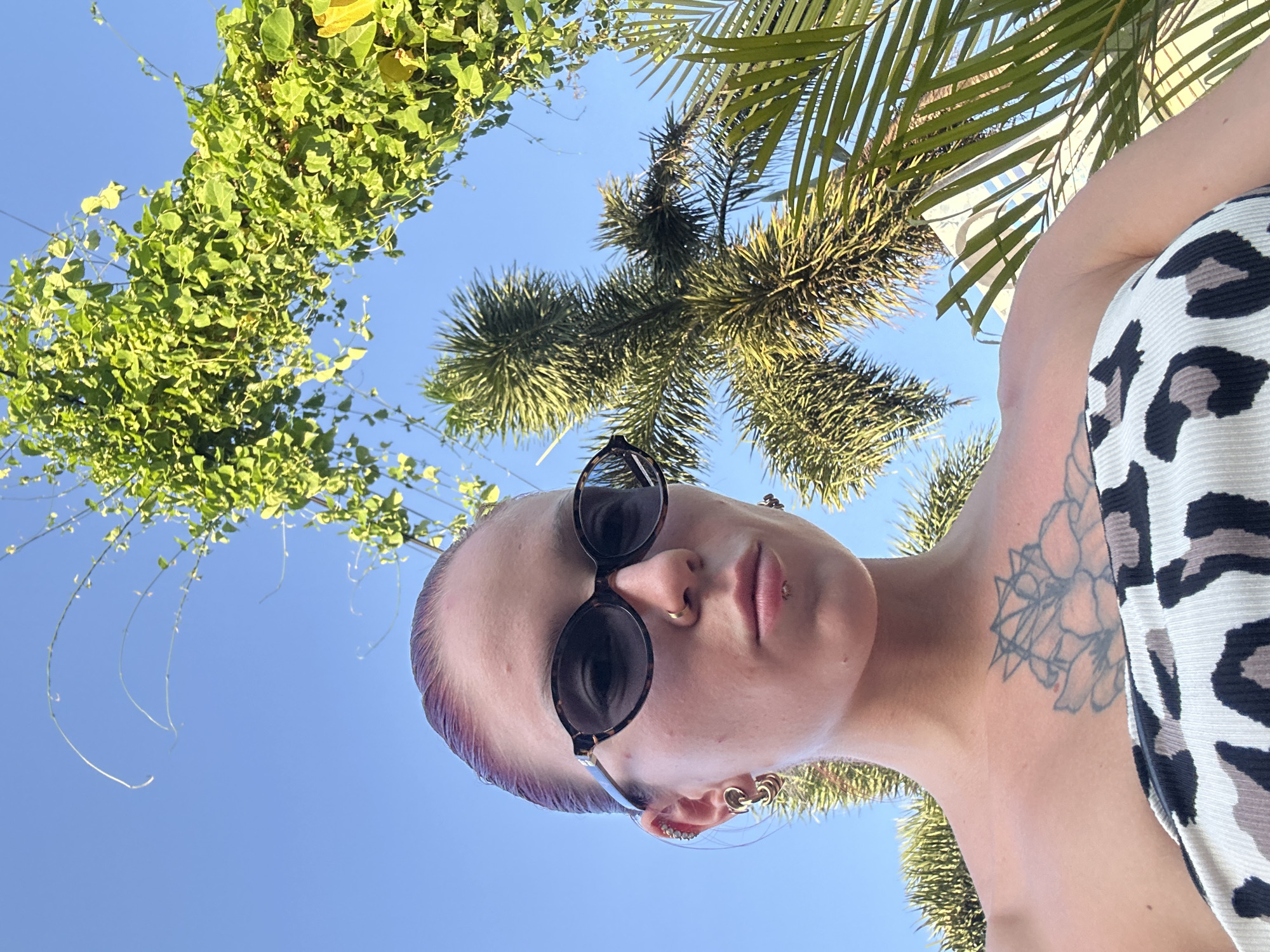 A low-angle shot shows a person wearing sunglasses, a nose ring, ear piercings, and a top with a black and gray animal print. The person has a tattoo on their left shoulder. The sky is visible between the person and the foliage, with palm trees and green vines framing the shot. The location is potentially Dalung, Indonesia.