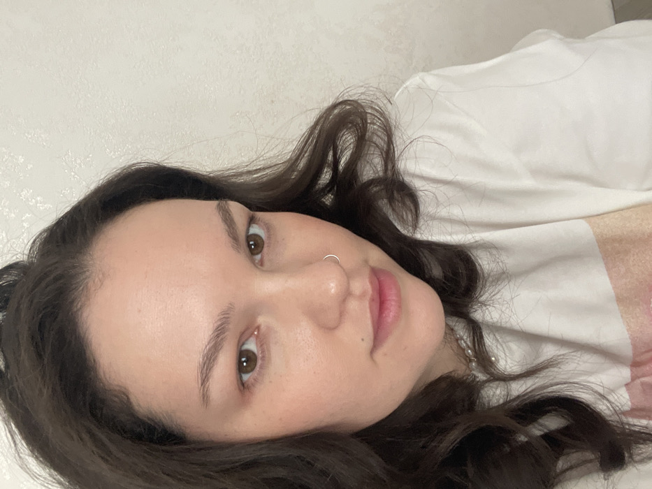 A woman lies on a white surface, likely a bed. Her face is angled towards the camera. She has brown hair and brown eyes, with a nose ring. Her skin is fair with light freckles. She wears a pearl necklace. A white shirt covers her shoulder. The background is a blurry white surface.