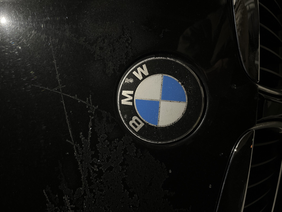 - "The image presents a close-up, downward-angled view of the front hood of a black BMW vehicle, located in the city of Smolyan, Bulgaria" by FM-UqHze2, licensed under CC BY 4.0