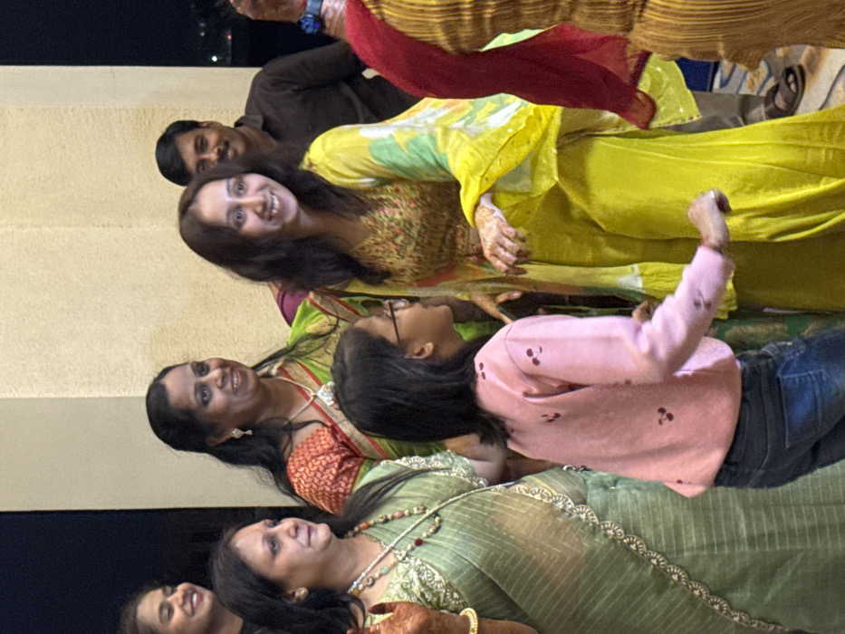 The scene depicts a group of eight individuals at a social gathering in Malasar, India. The setting appears to be an indoor or semi-outdoor space during evening or nighttime hours, indicated by the dark background and illuminated foreground against light-colored walls or pillars. From left to right: 1. A woman with dark hair is partially visible, smiling towards the right. 2. In the mid-ground, a woman with dark hair and a light green saree featuring an embroidered border, a multi-beaded necklace, and henna-decorated right hand, is looking to the right with a subtle smile. 3. Behind her, another woman with long dark hair, wearing a green saree with an orange/red patterned blouse/pallu, a pendant necklace, and earrings, smiles towards the right. 4. In the immediate foreground, a young girl with shoulder-length dark hair and glasses wears a light pink long-sleeved top with dark patterns and blue jeans. She looks towards the right, her body positioned as if in motion. 5. Adjacent to the girl, a woman with long dark hair, wearing a vibrant yellow ensemble with a patterned top and a light green/yellow tie-dye dupatta, smiles towards the right. Her hands are adorned with henna. She appears to be in motion. 6. Behind these two, a man with short dark hair and a mustache, wearing a dark brown/black collared shirt, smiles towards the right. 7. To the far right, partially visible, are parts of two individuals, one in a red garment and another in a golden-brown textured garment, both seemingly also in motion. Multiple individuals display henna (mehndi) on their hands. The overall atmosphere suggests a celebratory event or social interaction, with several participants smiling and appearing engaged.