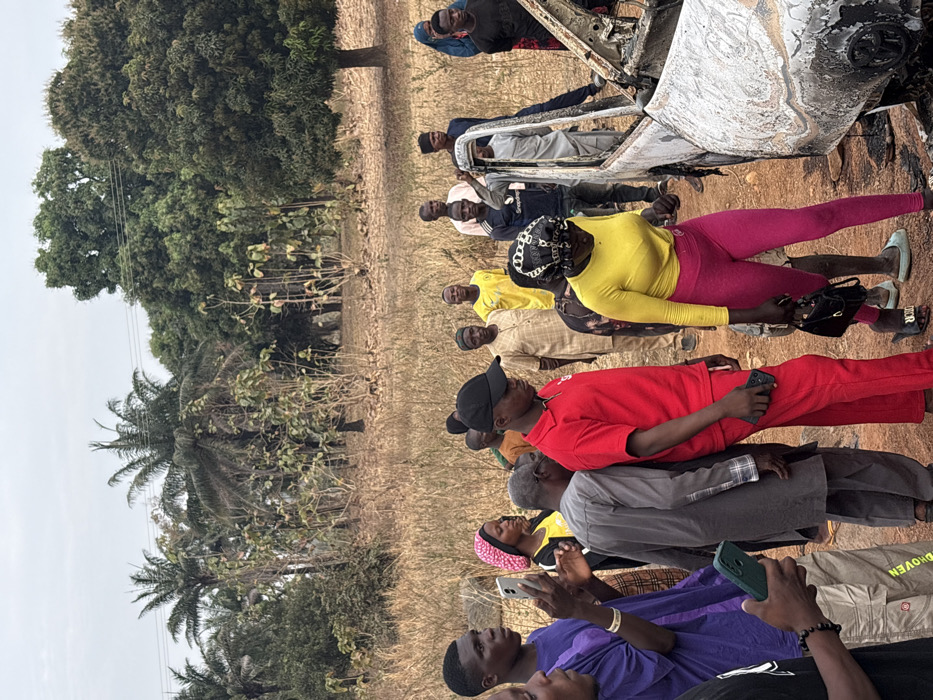 A group of people stand in a field next to a burnt-out vehicle