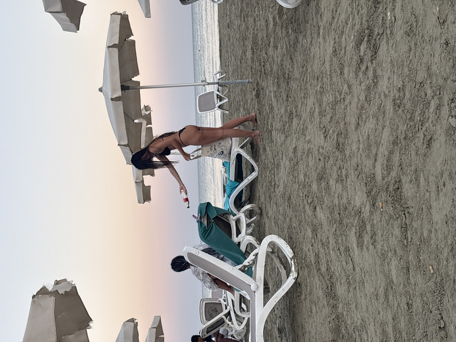 This image captures a beach scene at dusk or dawn in Larnaca, Cyprus. The foreground is sandy, textured, and contains scattered debris including cigarette butts. In the center-right, a woman with long, dark hair stands in a black two-piece bikini. Her left arm is extended forward, holding a white bottle with a red cap or label towards a beach chair. Her right hand holds a white canvas tote bag with a blue graphic of Cyprus and an eye-like symbol. To the left of the standing woman, a white plastic beach chair is draped with a light blue towel. Further left, another person with braided hair is seated on a white plastic beach chair, facing away from the camera, wearing light-colored attire. Another person is partially visible seated on a beach chair in the far left. The scene is populated by multiple white plastic beach chairs and at least three large, light-colored beach umbrellas, two prominent in the upper-left and center-right. The background reveals a calm body of water under a sky displaying a gradient of soft pink, orange, and pale blue hues. A faint human figure is visible in the distant water.