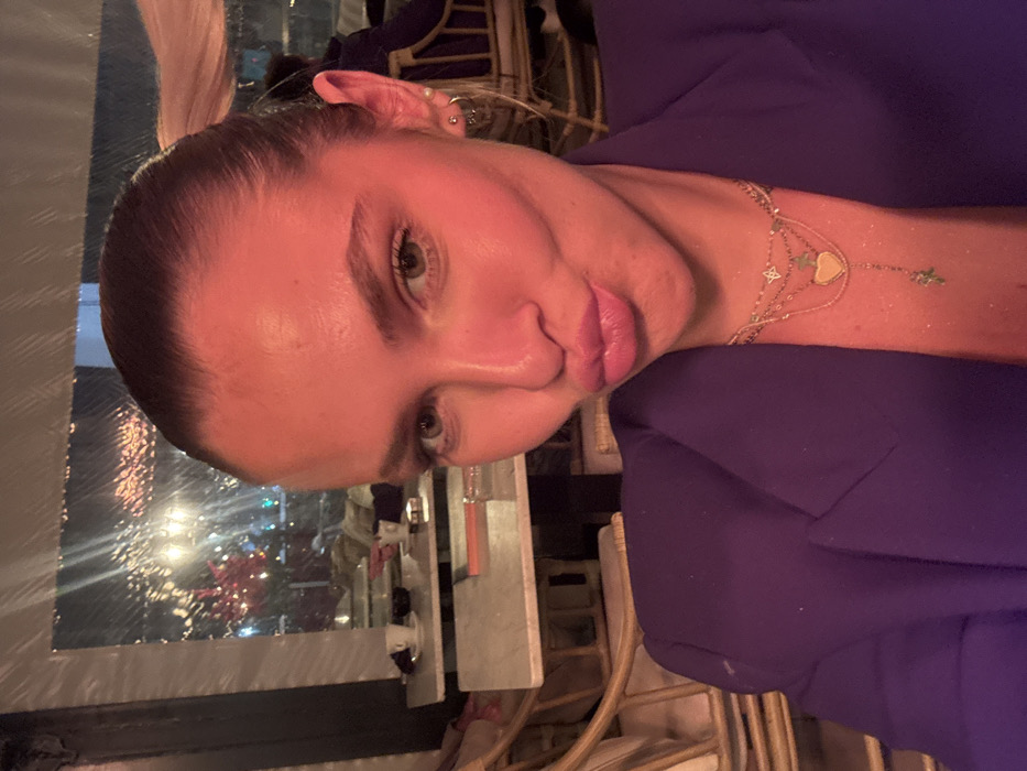 A woman is wearing a purple blazer and a gold, layered necklace with charms, including a heart and shamrock. She appears to be in a restaurant, evident from the table and chairs in the background. Outside the window, city lights are visible. The focus is on the woman's face, highlighting her light skin, hazel eyes, and pink lips. Her hair is pulled back, revealing a clean hairline and multiple piercings in her ear.