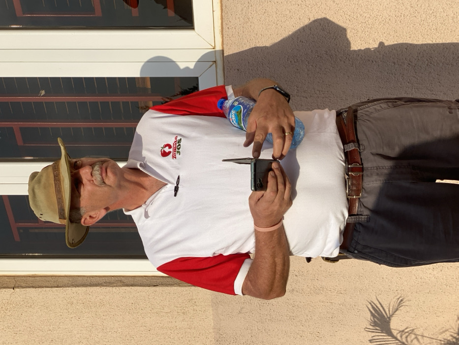 An adult male stands outdoors in Kwarau, Nigeria, facing slightly to his left (viewer's right). He wears a khaki-colored fedora-style hat, a white polo shirt with red short sleeves and a "Tomato Joe's" logo on the left chest, a dark brown belt, and dark grey cargo pants. A microphone clip is attached to his shirt placket. He holds a dark-colored smartphone, open, in both hands, and a clear plastic water bottle with a blue cap and "Sorgon" label in his right hand. A light pink wristband is on his left wrist, and a dark watch and a ring are on his right wrist and ring finger, respectively. He is positioned in front of a textured light beige wall. To his right, a white-framed window with dark glass and internal red grid patterns is visible. Bright sunlight casts shadows, including a plant shadow on the wall to his left and a human shadow on the wall to his right.