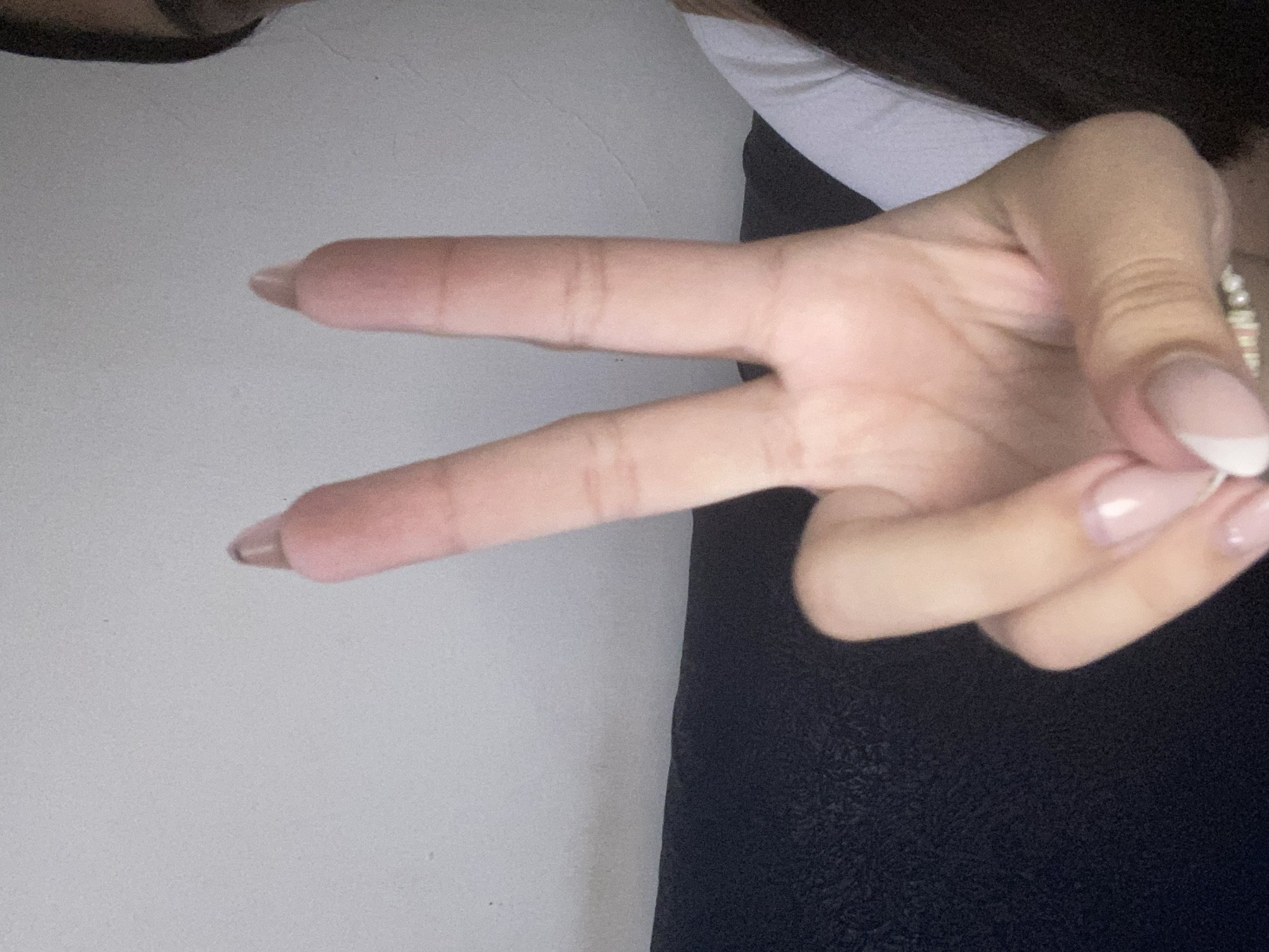 A close-up, slightly blurred image shows a hand making a peace sign. The index and middle fingers are extended upwards, while the other fingers are curled. The fingernails are manicured with a nude base and white tips, except for the extended fingers, which are unpainted. A silver ring is visible on one of the curled fingers. The background is out of focus, with a portion of a white garment on the left and a dark, textured material on the right. The location is not discernible from the image.