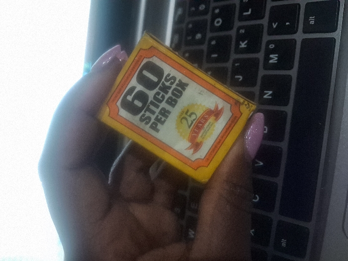 A hand with light purple painted nails holds a small yellow box with orange and white detailing against a black keyboard background. The box reads "60 STICKS PER BOX" in bold lettering. A circular logo on the box declares "25 YEARS" within a red banner and golden ribbon design. The keyboard shows keys like "M", "N", "K", "L", "alt", and "V". A dark cylinder can be seen blurred in the background.