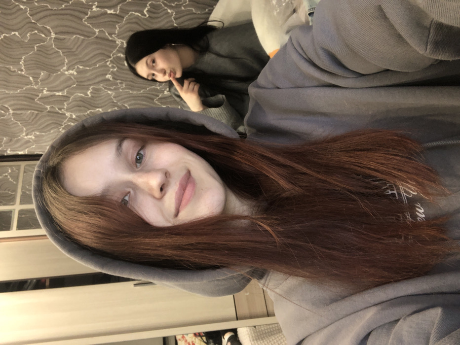 In what is identified as a residential setting in the city of Foki, Russia, two young females are depicted. The primary subject, positioned in the foreground, is a female with long, reddish-brown hair and light eyes, looking directly at the camera with a subtle smile. She is wearing a grey hooded sweatshirt with the hood pulled up; a white graphic is partially visible on the front of the garment. Behind and to the right, a second female with long, dark hair is visible, slightly out of focus. She is wearing a grey top and is performing a playful gesture, pressing her right index finger against her pursed lips while looking in the general direction of the camera. The immediate background on the right features a grey wall adorned with an irregular white pattern. To the left, a light-colored wooden wardrobe or cabinet is partially visible. The scene is illuminated by interior lighting.