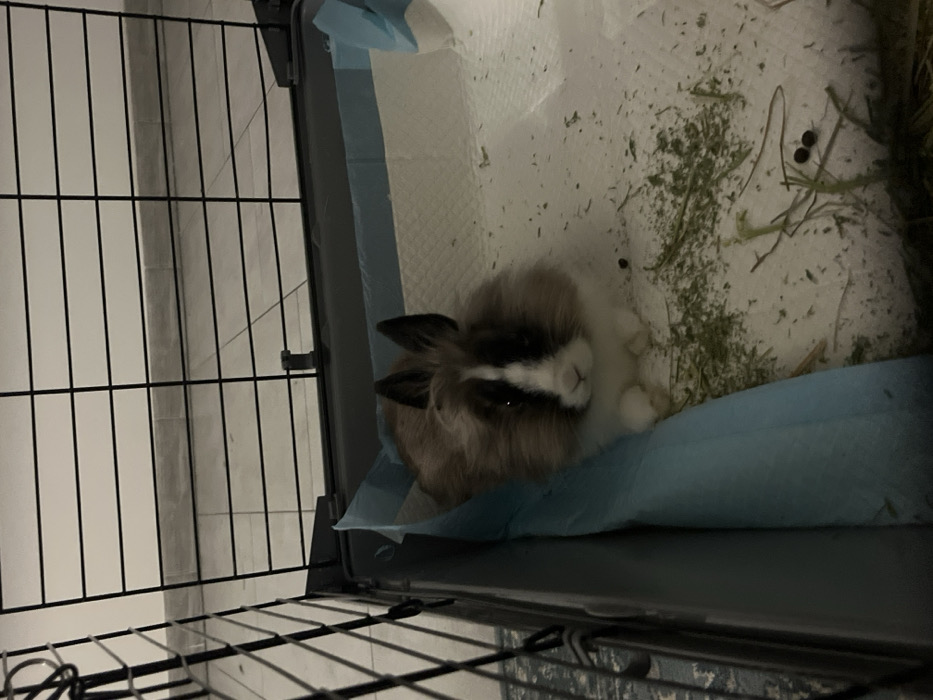 - "Inside a cage, a fluffy brown and white rabbit rests on a blue pad" by FM-PwRFu2, licensed under CC BY 4.0