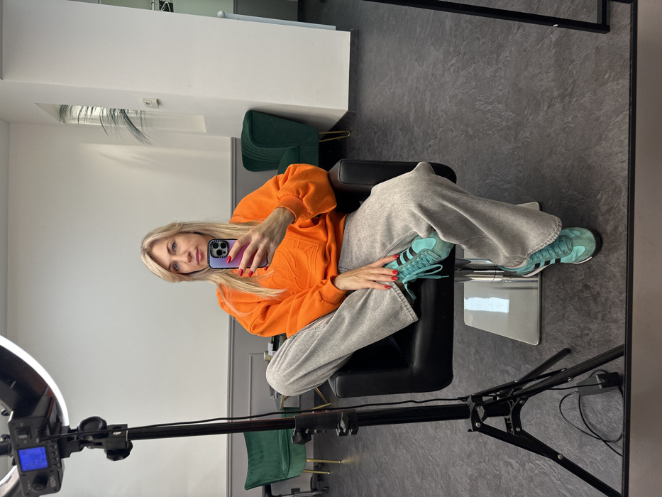 An adult female is seated in a black hydraulic salon chair, taking a mirror selfie in a professional interior space, identified as a salon or studio in Berlin, Germany. The woman has blonde hair, fair skin, and red-painted fingernails. She wears an orange long-sleeved sweatshirt with an embossed design, light grey wide-leg jeans, and turquoise Adidas sneakers with black stripes. Her left leg is crossed over her right, and she holds a smartphone with a purple and pink gradient case in her right hand, aiming it towards the mirror. To the left of the frame, a black professional ring light with a visible display screen is mounted on a tripod stand. The background, seen as a reflection, features white walls with a dark grey chair rail, a dark grey floor, and two dark green velvet armchairs with gold legs. A small, dark, round table with a white cup is positioned between the left armchair and the woman's reflection. A vertical niche in the far right wall contains a green plant.