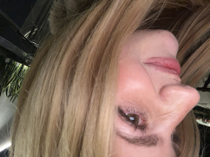 The image presents a close-up, three-quarter profile view of the right side of a female individual's face, taken in Naucalpan de Juárez, Mexico. The subject exhibits light brown to blonde hair, a brown eye with distinct eyelashes, and fair skin displaying a subtle flush on the cheek. Her lips are slightly parted in what appears to be a gentle smile, coated with a light pink, glossy substance. The bridge of her nose shows a slight curvature. The background is out of focus; to the left, indistinct red and white lights, resembling string lights, are visible against a dark backdrop. To the right, vertical green foliage, consistent with an indoor plant, is contained within a dark planter, adjacent to dark, reflective architectural elements. The scene is illuminated by ambient indoor lighting.