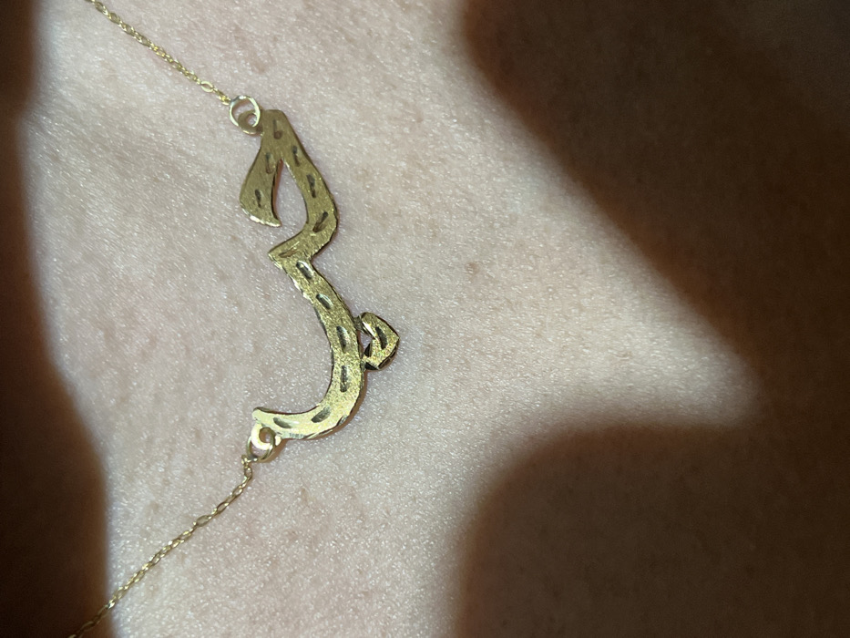 - "A gold necklace with a pendant in the shape of an Arabic letter is on a person's chest" by FM-PwtkB2, licensed under CC BY 4.0