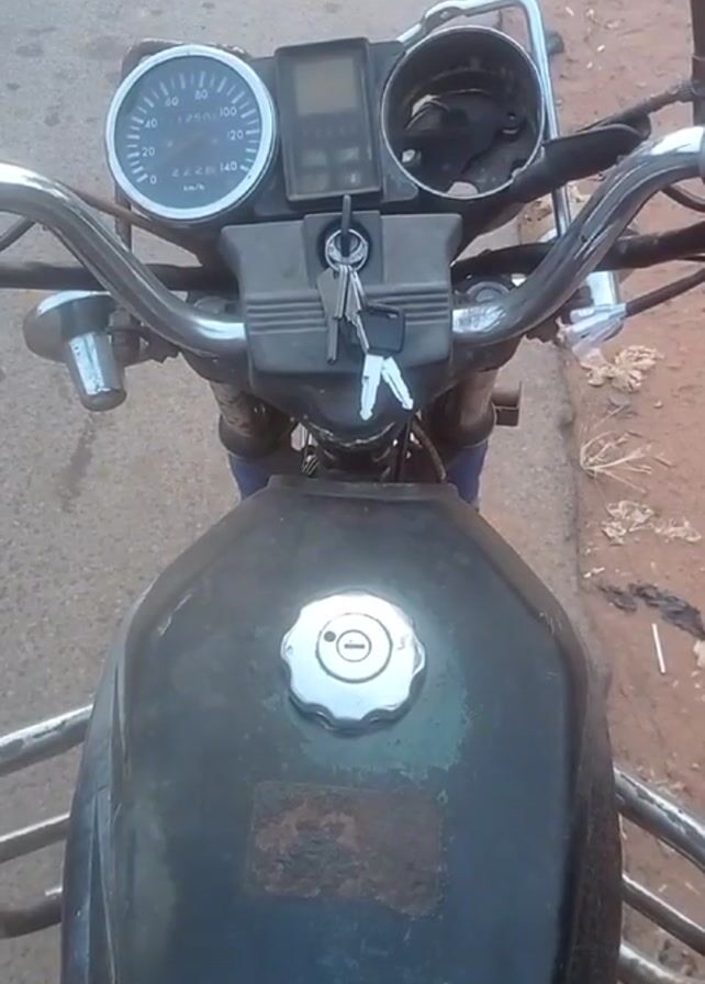 point-of-view shot from the seat of a motorcycle. The motorcycle is stationary on a paved road. The dashboard is visible, showing a speedometer and a digital display, with keys in the ignition. The gas tank is in the foreground, with a silver cap. To the right of the road is a dirt shoulder. In the distance, a person is visible near a corrugated metal structure. The weather appears to be sunny.