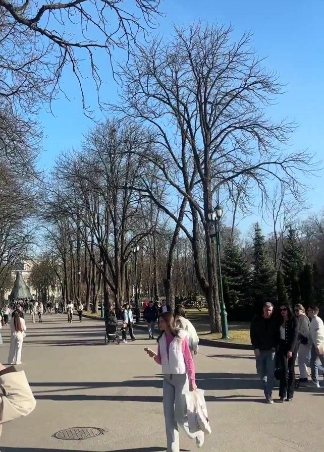 bustling park on a sunny day. A wide, paved pathway stretches through the park, flanked by tall, bare trees on either side. Many people are walking along the pathway, some in groups, others alone. Their clothing varies, suggesting a casual, everyday setting. At the end of the path, a tall structure or monument is visible. The sky is a clear blue, and the overall atmosphere is lively and pleasant. The trees lack leaves, implying it might be late winter or early spring. The focus is on the people and their movement through the park.