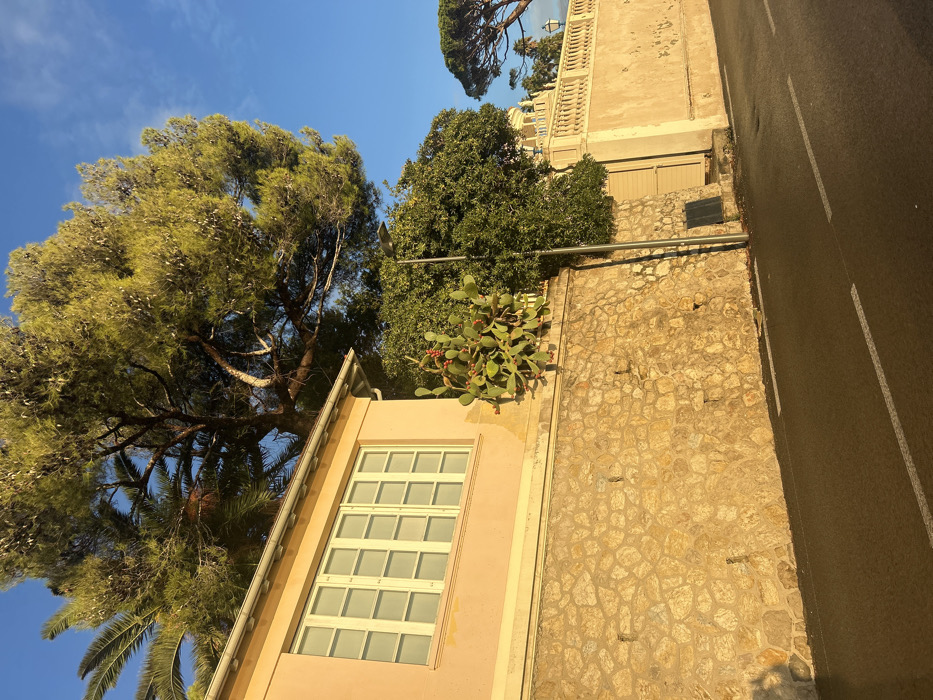 The image depicts a sunlit street scene in Antibes, France, characterized by warm, low-angle natural light indicating either early morning or late afternoon. In the foreground, an asphalt road displays a double dashed white line. To the left, a sturdy retaining wall built from irregularly shaped, light-colored stones supports a structure with a peach-toned stucco facade. This building features a large, rectangular window with light-colored frames, divided into multiple panes. A white-painted gutter runs along the eaves directly above the window. A large prickly pear cactus (Opuntia) with numerous green pads and several mature red-orange fruits grows prominently on the stucco wall, to the immediate right of the window. Adjacent to the stone wall and the cactus, a grey cylindrical streetlamp pole rises vertically. Beyond this, dense green foliage obscures parts of the background. Further to the right, a lighter-colored, partially discolored wall with a recessed, light-toned wooden access gate is visible. Above this wall, a white ornate balustrade, likely part of a more distant building, can be seen. The upper portion of the image is dominated by mature trees, including a large Mediterranean stone pine with a full, textured canopy illuminated by the sunlight, and a section of a palm tree on the far left. The sky above is clear and deep blue. No people or specific actions are visible in the scene.