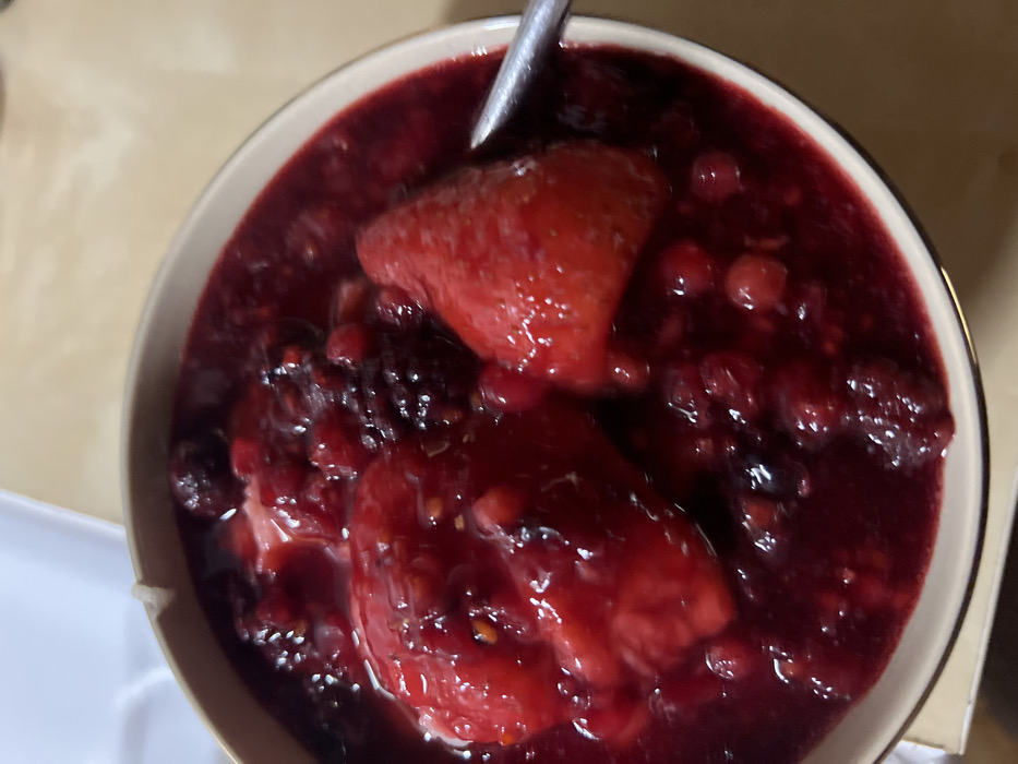 A close-up shot captures a bowl filled with a dark red, berry-laden concoction. Strawberries and what appear to be blackberries and cranberries are visible, submerged in a thick, glistening syrup. A spoon rests within the bowl, partially submerged in the liquid. The dish's presentation suggests a dessert, likely fruit compote or a similar sweet preparation. The bowl itself has a light-colored rim.