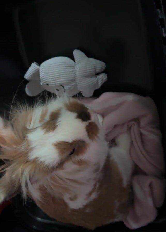 A high-angle shot shows a rabbit inside of a dark carrier. The rabbit is mostly white, with patches of brown fur. It is curled up on a pink blanket. Next to it is a white stuffed rabbit toy with a simple, smiling face. A hand with pink fingernails and a diamond ring reaches into the frame and gently pets the rabbit on its head. The rabbit lifts its head slightly, then settles back down.