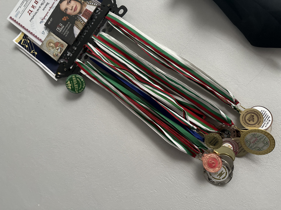 In the city of Odarne, Bulgaria, a collection of academic and cultural achievements is displayed against a light grey, textured wall