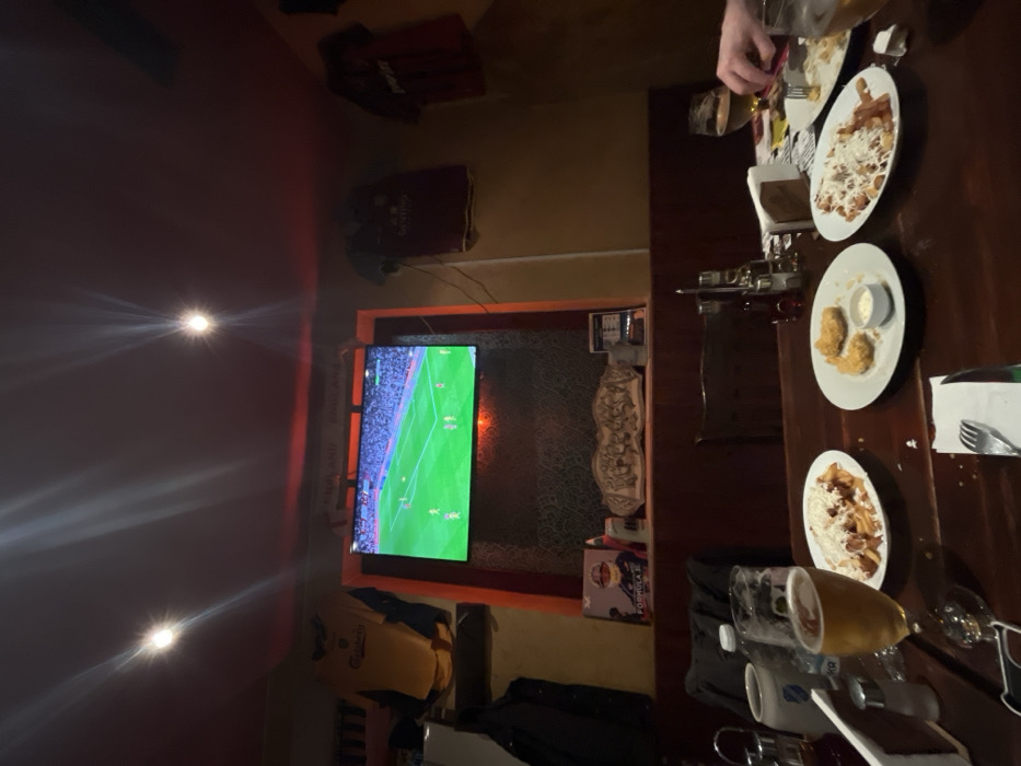 The image depicts the interior of a dining establishment, identified as being located in Shumen, Bulgaria. The scene is illuminated by two bright, recessed spotlights on a dark-colored ceiling, casting distinct light rays. The walls are a warm, light brown or tan, topped by a red trim. Centrally positioned on the back wall, a flat-screen television is mounted within a recessed niche framed by red or orange light. The television displays a live football (soccer) match on a green field. Above the television, partially visible white text on the wall reads "ENGLAND ENGLAND." To the left of the television, a yellow football jersey, possibly featuring a "Carlsberg" logo, hangs on the wall, with a dark jacket suspended below it. To the right, two additional football jerseys, one dark red and one darker, are displayed. Below the television, on a dark wooden shelf, several objects are arranged: a box or plaque with "FORMULA 1" text, an ornate decorative relief sculpture, and a small blue sign with white lettering. In the foreground, a dark wooden table is set for dining. Three plates containing food are visible: one holds pasta topped with a white substance, another contains several breaded chicken pieces with a small white dipping sauce, and a third, partially consumed, also features pasta with a white topping. Beverages include a full glass of amber liquid, likely beer, a partially consumed glass of the same, and a clear plastic bottle of water. Various condiments, including salt and pepper shakers and oil/vinegar bottles, are clustered on the table. Cutlery (forks, knives), napkins, and a white ceramic mug or stein are also present. A human hand is visible on the right side of the table, holding a fork near a partially eaten plate. The overall environment suggests a casual eatery or sports bar atmosphere.