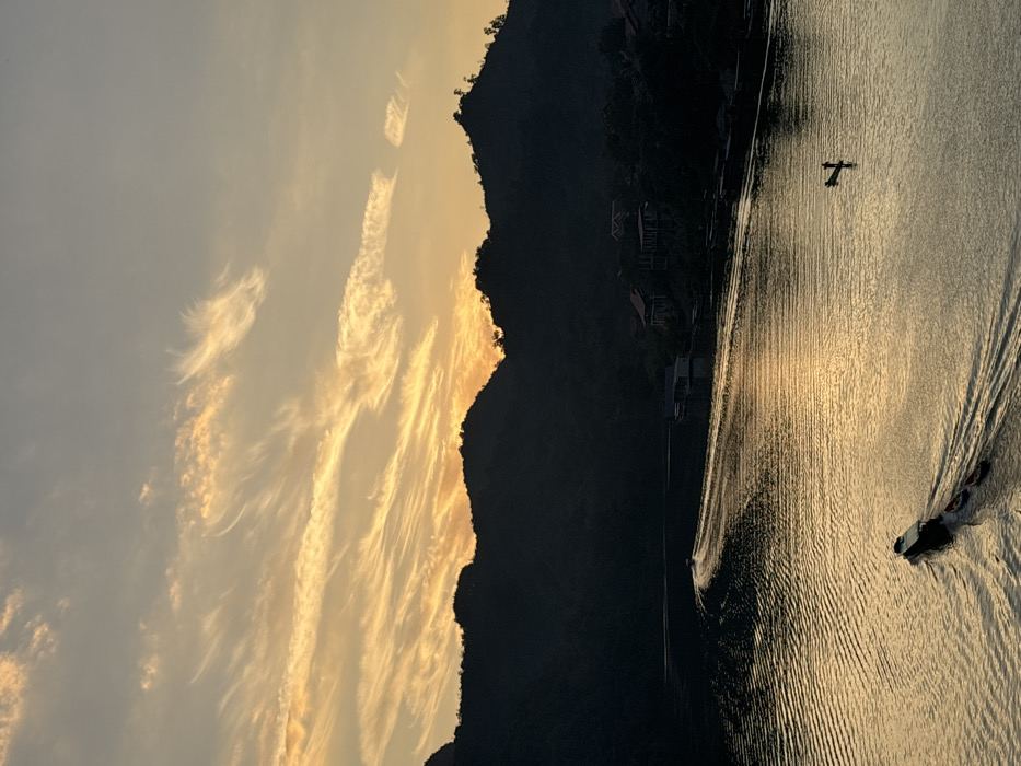 The image displays a wide river scene at sunset or sunrise in Sophoun, Laos. The sky is a blend of light grey and warm orange-yellow, with elongated, wispy clouds illuminated by the low sun. A range of dark, forested mountains forms a silhouette across the horizon, with small structures and residences visible along the right bank at their base. The river's surface reflects the sky's warm light, featuring ripples and wakes. In the lower left quadrant, a long, dark vessel with a canopy is moving away from the viewer, leaving a distinct V-shaped wake, and towing three smaller, narrow boats behind it. Further to the right, a solitary individual stands in a smaller, narrow boat, operating a pole or oar.