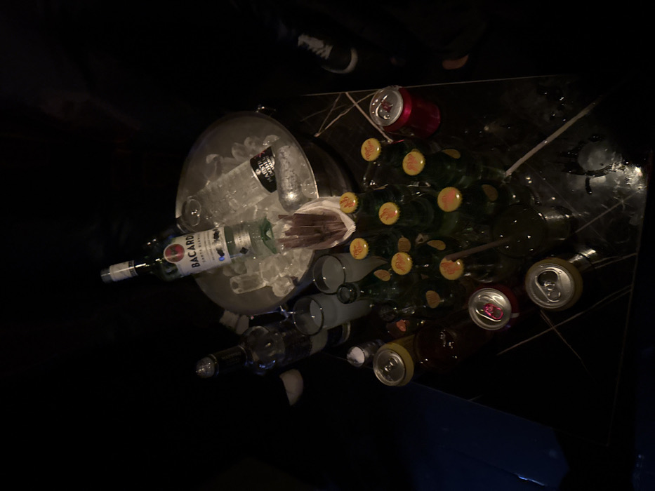 The image depicts a dark, glossy table surface, possibly marble, showing white vein patterns and wet spots from condensation or spills. Dominating the upper center is a silver metal ice bucket filled with ice, containing a partially full bottle of Bacardi Carta Blanca rum and an empty or near-empty bottle labeled Maestro Dobel. Adjacent to the ice bucket, a cluster of approximately ten small green glass bottles with yellow caps, some full and some partially consumed, are visible. Three aluminum cans, one red and two silver/yellow, are also on the table, appearing open. Two clear glasses hold a light-colored liquid. A small white container with white granular contents and a bundle of brown straws are also present. The scene is dimly lit, suggesting a bar or nightclub environment. The lower right corner reveals the foot of an individual wearing a dark shoe with a white sole. No specific visual cues within the image definitively pinpoint a precise location in Monterrey, Mexico, beyond the general nature of a social gathering in a nightlife setting.