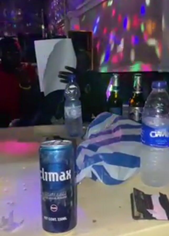 table at night with two men sitting around it in a club or bar, with colorful disco lights in the background. A man in a red shirt is seated to the left, and the other man, wearing a darker shirt, appears to be reading from a white sheet of paper. On the table is a can of Climax energy drink, two bottles of water, two bottles of beer, a striped blue-and-white cloth, and a small black card or wallet. The overall atmosphere is festive, with music playing and colorful lights creating a party vibe.